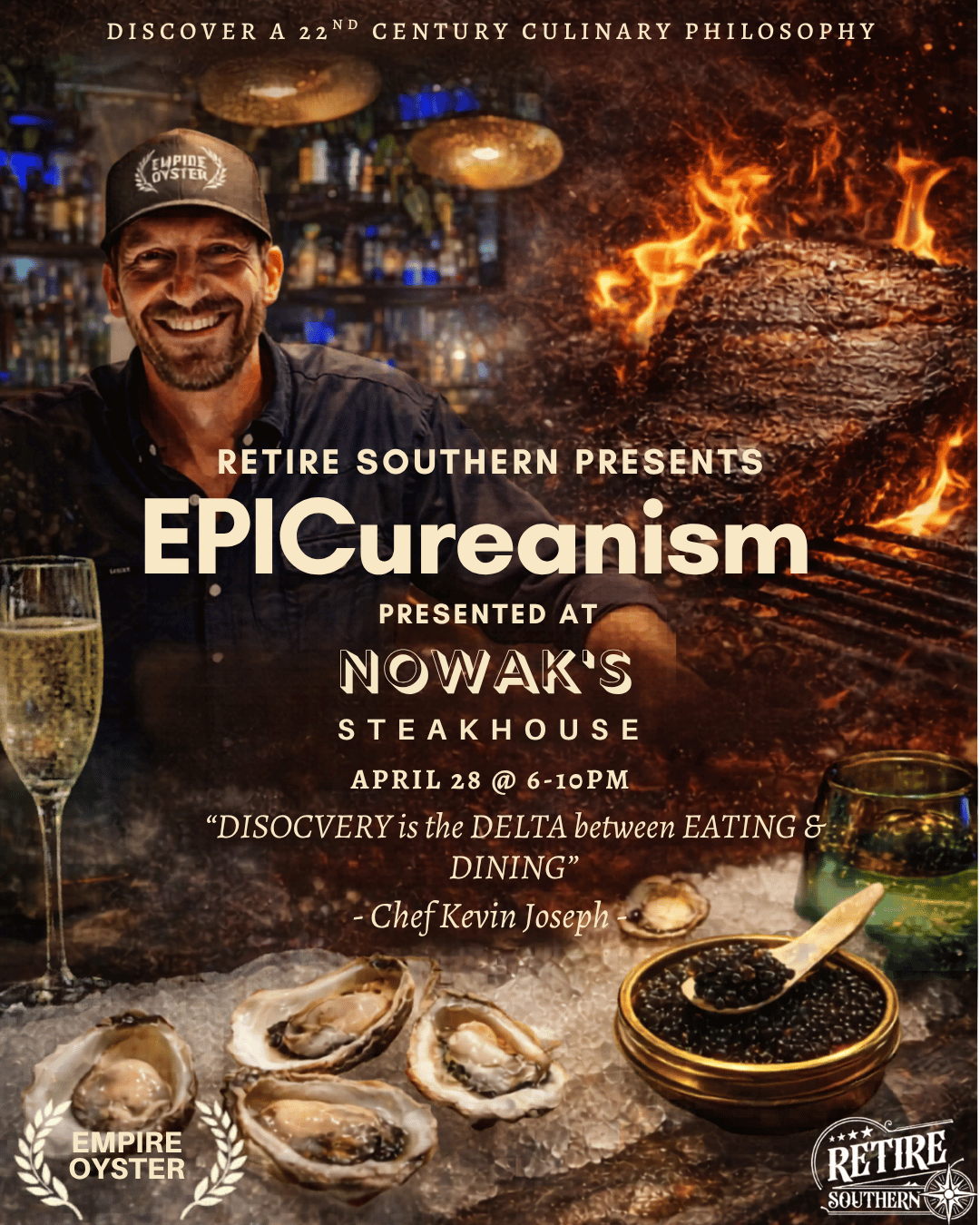 The culinary experience is designed in an entirely different way than almost all other fine dining. As a result, we are able to deliver in 5 or more dimensions vs the standard three that most restaurants can feature: Food, Service & Atmosphere. So, Remember that Tuesday is the new Friday and RALLY A CREW for a really fun, meaningful and memorable evening. The deeper you read into this “22nd Culinary / Hospitality Philosophy” the more you will likely agree. www.empireoyster.com/epicureanism